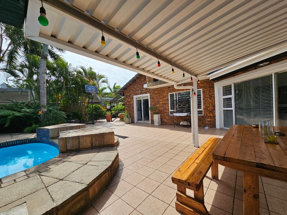 Outdoor entertainment areas include a covered patio with built-in braai, pergola area for additional socializing or dining, Sparkling low-maintenance swimming pool.