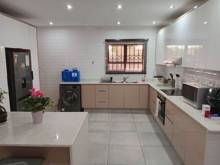 Entertainer's dream for family living in a peaceful neighborhood, with a built-in braai and marble pool, modern granite kitchen and generous living spaces. Four bedrooms, two bathrooms, double garage.